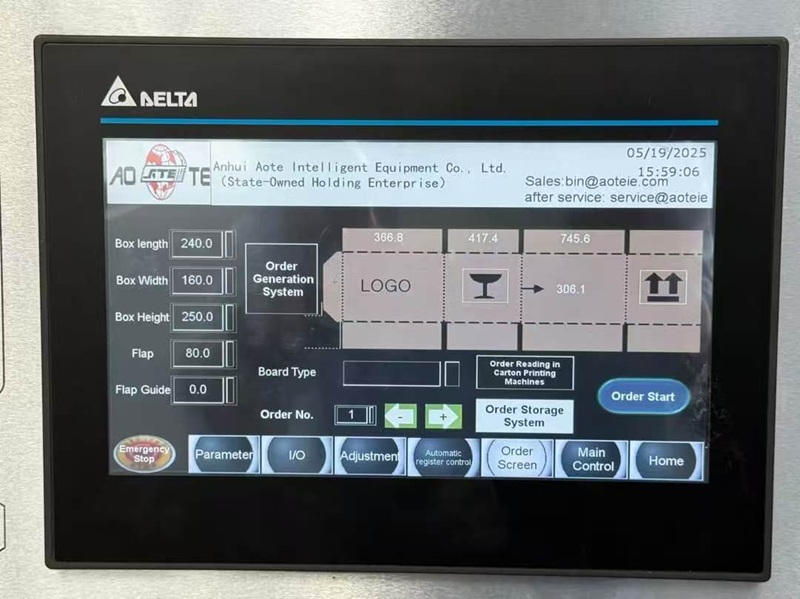 Equipped with a fully automatic production management system, operators only need to input order size information on the LCD touch screen, and the paper feeding section, printing section, slotting section and die-cutting section will automatically complete precise adjustments of various parameters such as axial and circumferential settings. The fully automatic adjustment mode significantly reduces labor costs and greatly improves enterprise production efficiency.