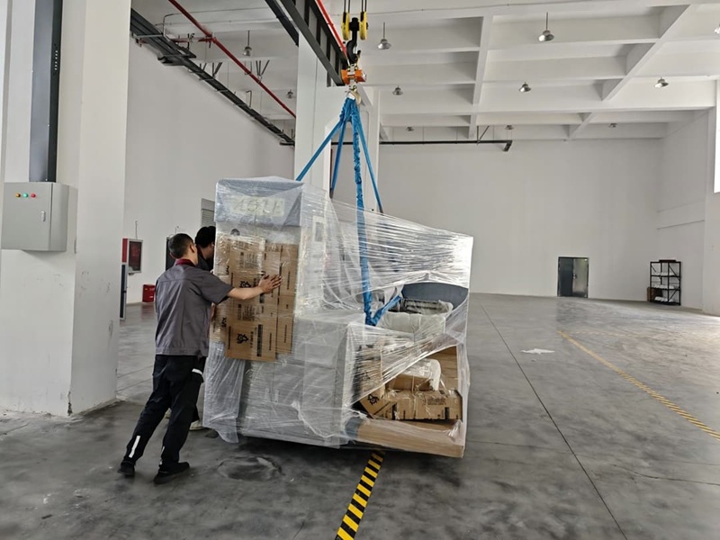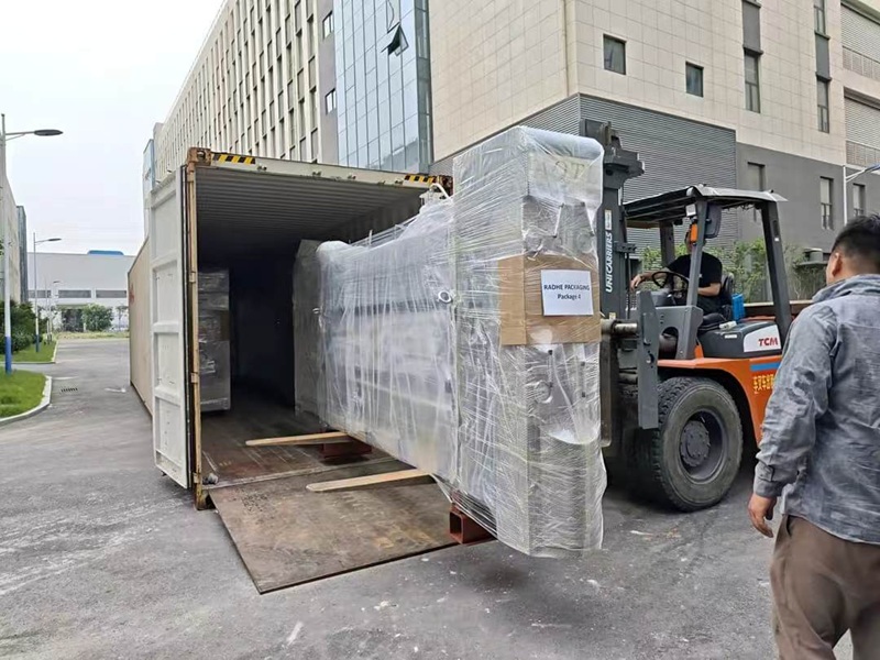 Aote staff are loading the Model ATFG-I Printer Slotter into the container.