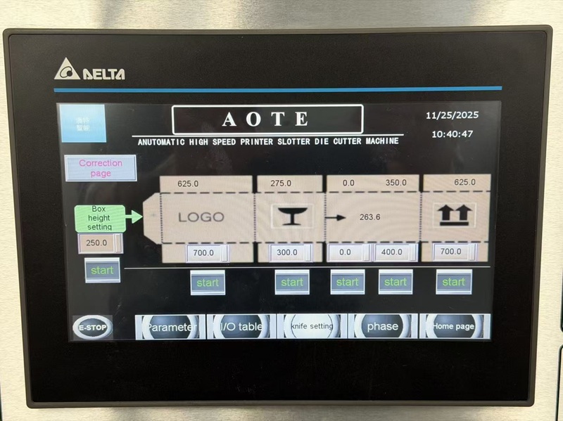 Automatic control system, merely an order of box information i.e. the axial and circumference data of all units is input in touch screen, the feeder, printer, slotter and die cutter will be set automatically, featuring accuracy and reliability, realize automation and enhance production efficiency.
