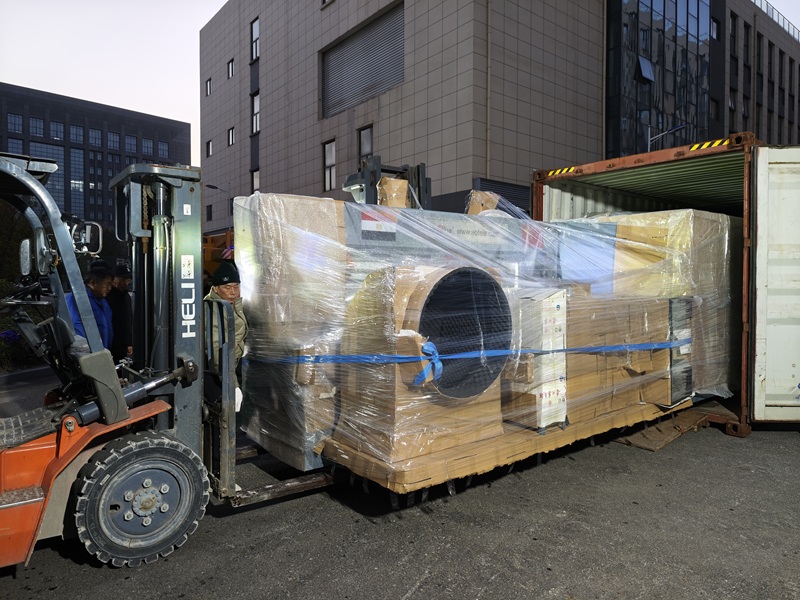 Aote staff are loading the ATFG-III Printer Slotter with Die cutter into the container.
