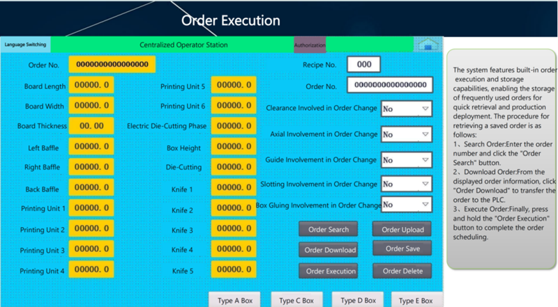 Automatic control system, merely an order of box parameters i.e. the axial and circumference data of all units are input in touch screen, then the feeder, printer, slotter and die cutter will be set automatically, featuring accuracy and reliability to realize automation and enhance production efficiency.
