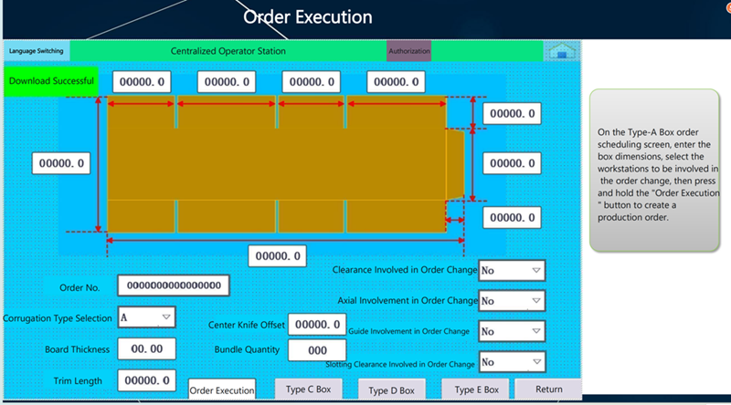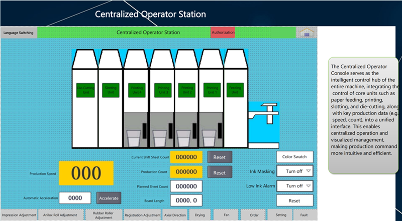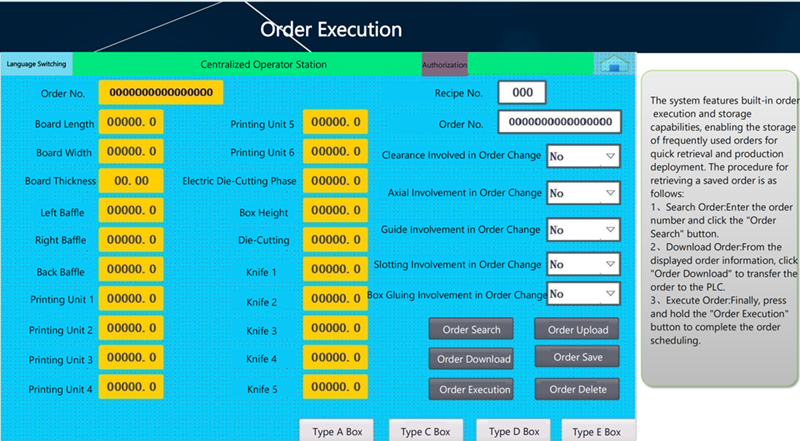 Automatic control system, merely an order of box parameters i.e. the axial and circumferential data of all units are input in touch screen, then the feeder, printer, slotter and die cutter will be set automatically, featuring accuracy and reliability to realize automation and enhance production efficiency.
