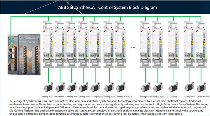 ●The machine adopts full servo drive with independent servo control for each unit, featuring high synchronization accuracy, stable and reliable operation to greatly improve register accuracy and production efficiency.